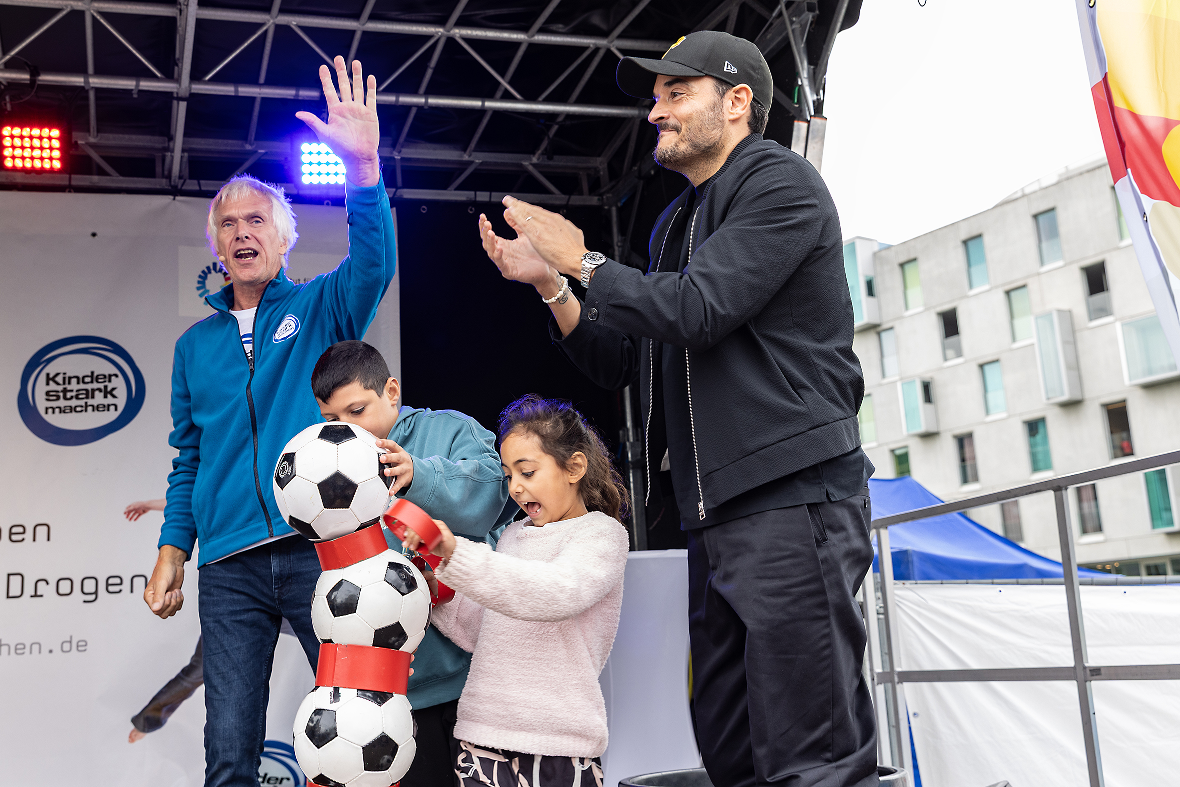 Im Rahmen des Festes überreichten Dezernent Robert Voigtsberger und der kommissarische BIÖG-Leiter Dr. Johannes Nießen einen Anerkennungspreis an Karin Hack, Leiterin der Kita Hunoldstraße, für ihr besonderes Engagement. Weitere Bühnengäste waren die UNICEF-Paten Jana Ina und Giovanni Zarrella, die sich gemeinsam mit den Kindern am Programm beteiligten.
